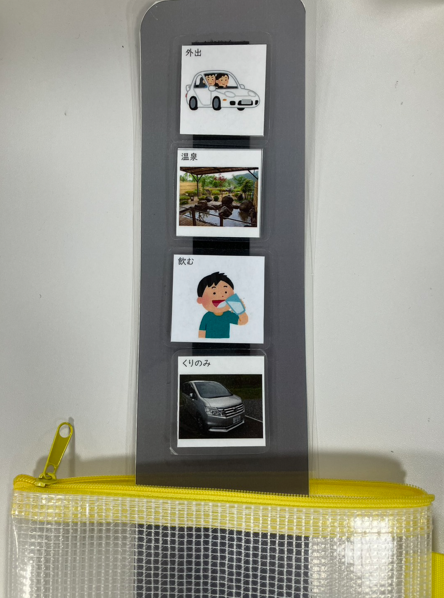 自閉症の方は頭の中で物事の順序を組み立てたてることが苦手という特性があります。その為、慣れない場所や人に不安を感じることがあります。そこで、写真のようにスケジュールで視覚的に示すことで、次に何があるのかをお伝えしています。終了したスケジュールに関しては、カードをはがしていき、カードがなくなったら終わりになります。