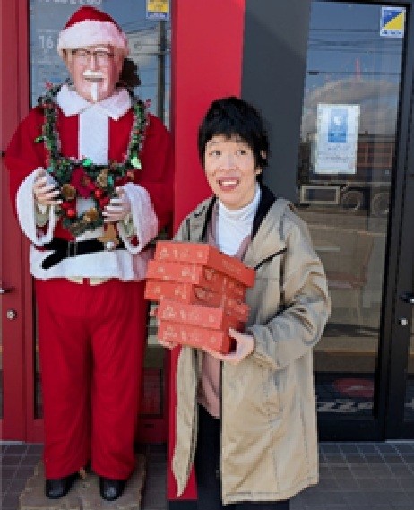 まずクリスマス会の準備では、 注文していたピザの受け取りに利用者も一緒に行ってくれました。