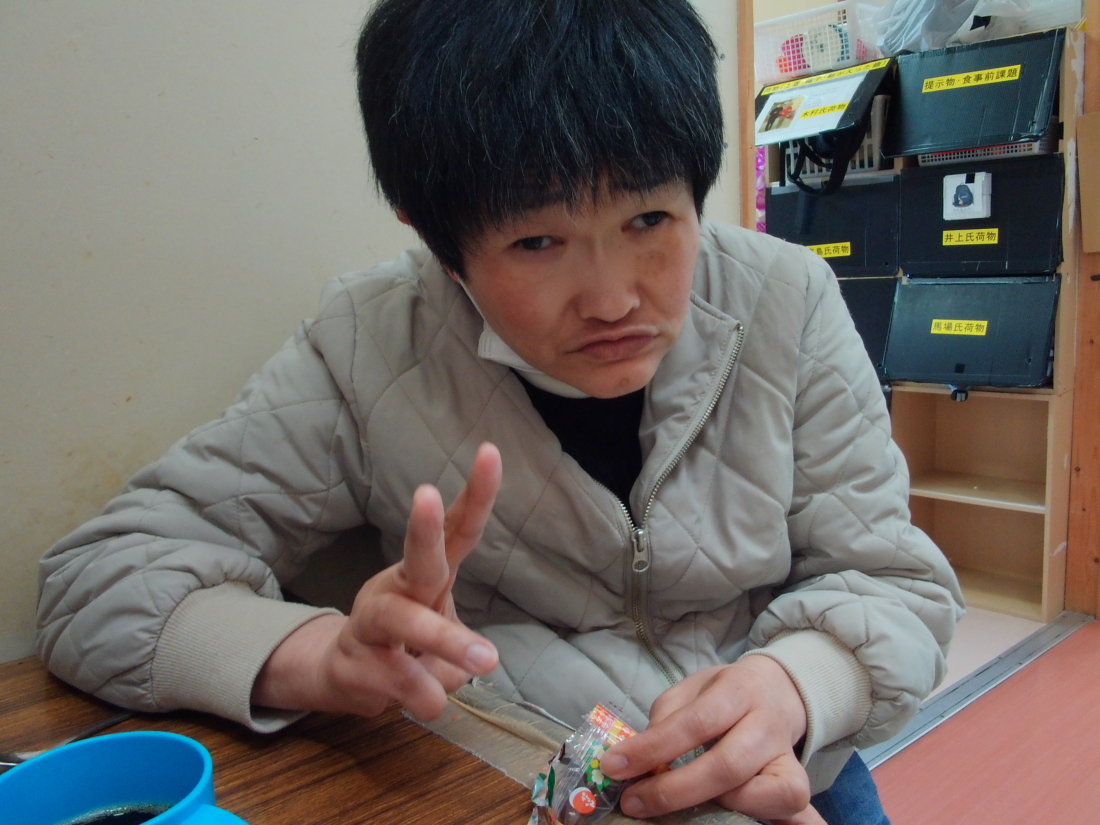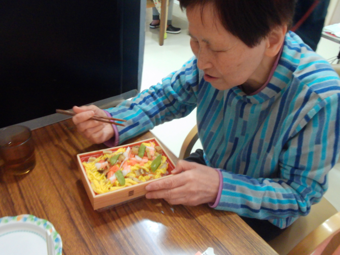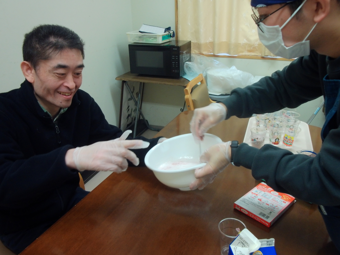 3月のおおざとの赤いやねでは、ひな祭りにちなんで昼食にちらし寿司とフルーチェ、コーヒータイムの時間にひなあられを食べました。利用者が昼食のデザート用のフルーチェをクッキングしました。